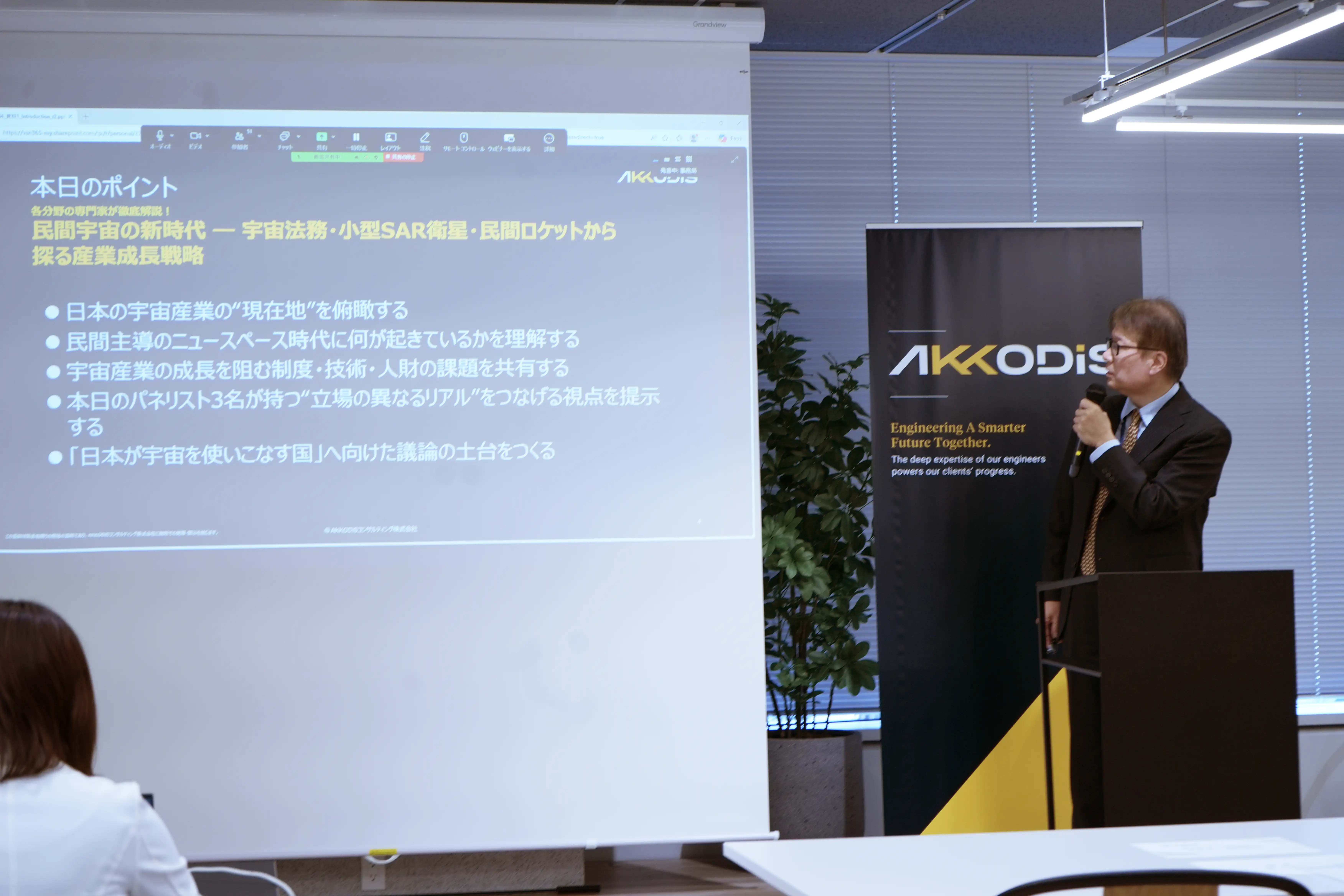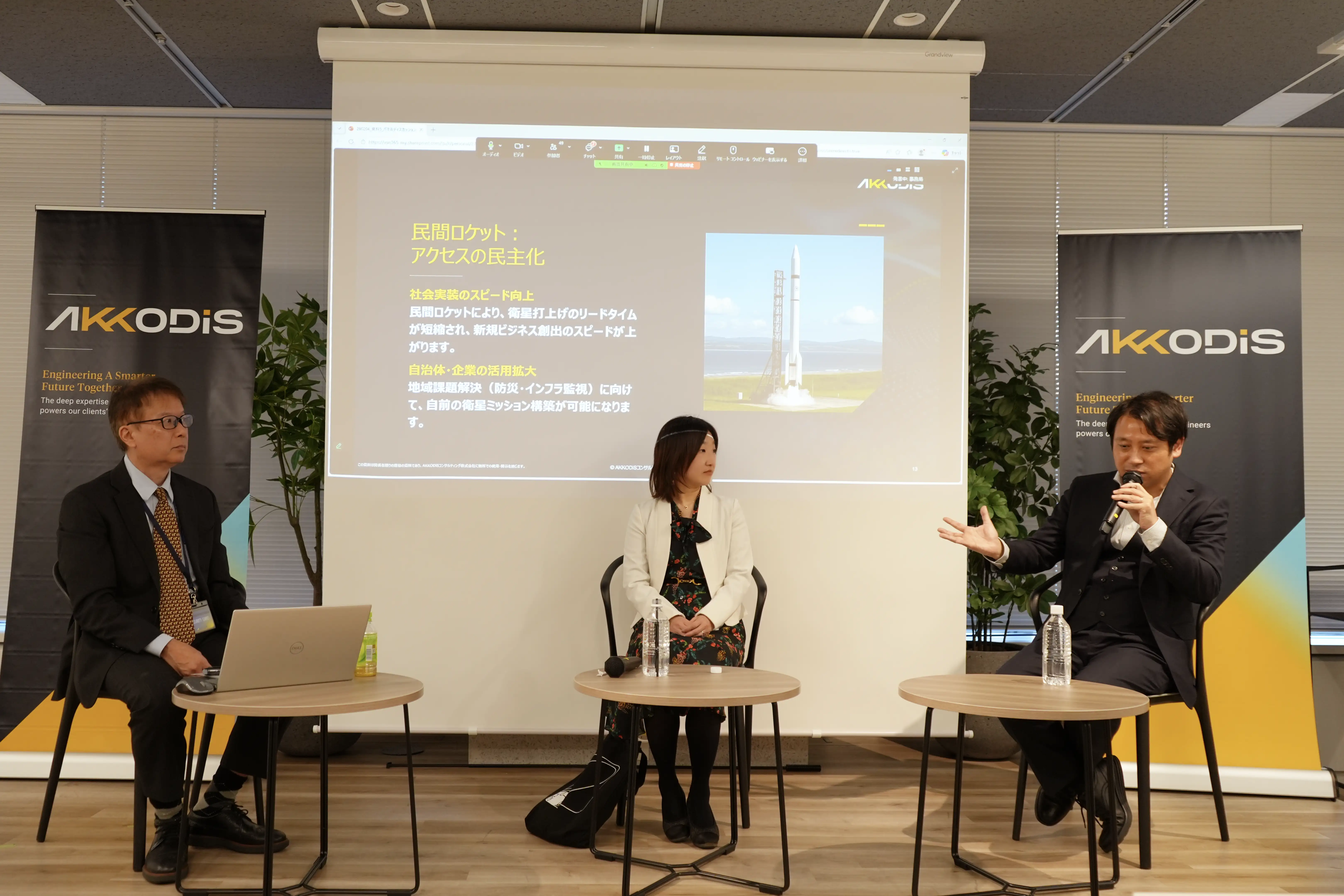 イベント冒頭ではAKKODiS People Development本部キャリア開発推進部 マスターインストラクターであり、JEITA(一般社団法人電子情報技術産業協会)の部品技術ロードマップ各委員を務める谷本 琢磨(工学博士)より、国内外の宇宙産業の概要と動きについて説明。その後GVA法律事務所弁護士の本間 由美子氏、インターステラテクノロジズ株式会社代表取締役の中山 聡氏、株式会社QPS研究所代表取締役社長 CEOの大西 俊輔氏の3名の講演が行われました。